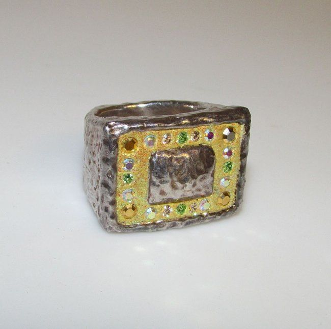 For your consideration is this fabulous vintage Art Deco Style sterling silver ring in wonderful vintage condition. This stunning statement ring features a geometric design in sterling silver accented with yellow enamel and colorful sparkly marcasites. The ring measures 3/4" wide at the widest point and is marked "925" on the inside of the band. Size 7. Stylish addition to any jewelry collection!