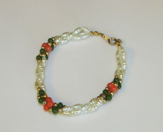 For your consideration is this lovely vintage baroque pearl, coral and jade vintage bracelet from 1960s in wonderful vintage condition. This bracelet features a multiple baroque pearl strand design accented with coral, jade, and gold plated beads. This lustrous piece measures about 7 1/4" long. An elegant piece to add to any collection. The versatile bracelet will look great paired up with a pearl necklace, or a jade necklace, or a coral necklace