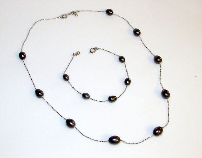 For your consideration is this elegant cultured black pearl and 18K gold plated necklace and bracelet set. This gorgeous and lustrous duo is classic and timeless. The necklace measures about 18" long and the bracelet is 7 1/2" long. The bracelet is marked "18K" and the necklace is marked "18K plated". The duo is in wonderful condition, no wear to the finish.