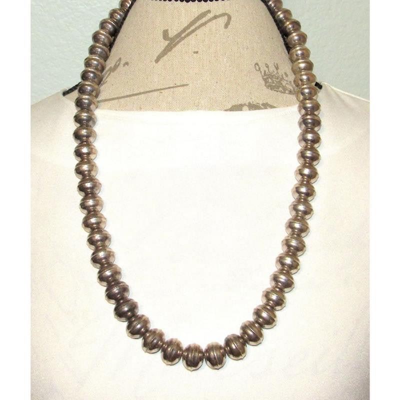 A striking and authentic mid-century Navajo Pearl necklace featuring handmade seamed sterling silver beads traditionally strung on early cotton cord. These substantial 16.5 mm Navajo pearls display classic hand-formed and hand-soldered construction with a beautiful vintage patina. The strand measures 30 inches, weighs approximately 100 grams, and is finished with traditional sterling silver cones and a hook-and-eye closure. Early cotton-strung Navajo pearls of this size and quality are exceptionally hard to find, making this a rare and highly collectible piece for serious collectors of vintage Navajo jewelry. FREE SHIPPING ON ALL JEWELRY ORDERS WITHIN THE US! WE SHIP ALL ITEMS IN-HOUSE!