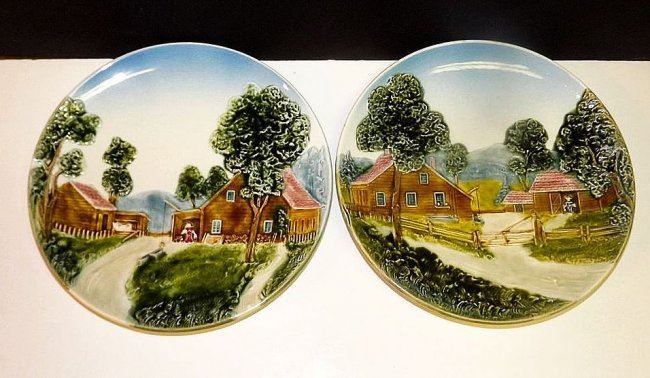 For your consideration is a pair of lovely vintage German Majolica decorative chargers with beautiful raised designs. The chargers feature gorgeous views of the German Alps and measure about 9 1/2" in diameter. Both pieces are numbered and marked "Made in Western Germany".