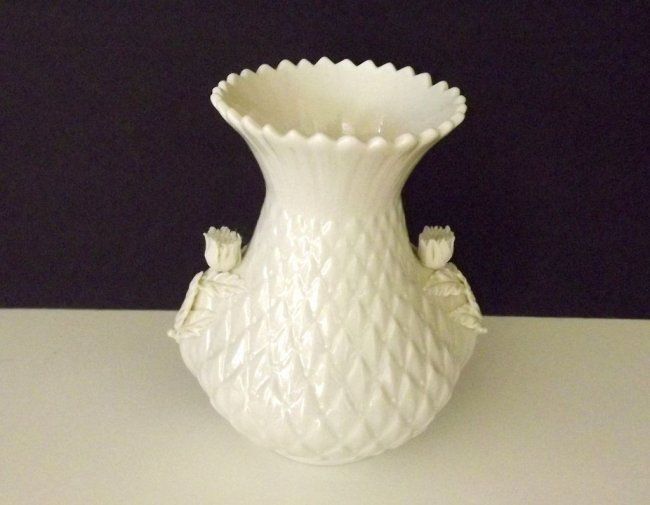 For your consideration is a gorgeous and rare Belleek Thistle Top Vase. The vase is a beautiful ivory color, and it accentuated by a flower on each side. It is in mint condition with a brown/golden mark, 1980. No chips, cracks, repairs. Measures a little under 6"