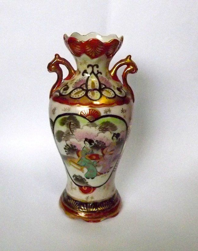 For your consideration is this exquisite and unique early Japanese Kutani Vase/Urn c. 1890s in wonderful condition! This gorgeous lustrous piece features a traditional detailed and vibrant Kutani motif design and features 2 Geishas with fans in the Japanese Garden. There is a Kutani stamp on the bottom of the piece that dates it to late 1890s. Very unusual piece with many details. It measures 8" tall. There are no chips, repairs, cracks. It displays beautifully! Gorgeous and unique piece!