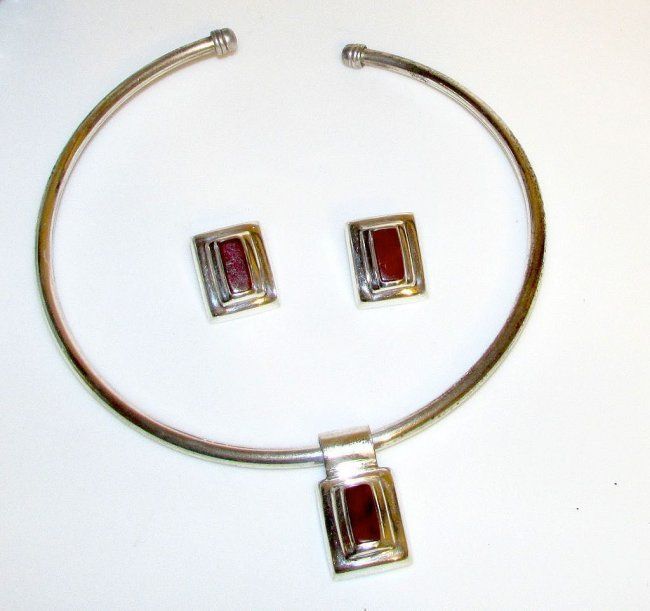 For your consideration is this stunning and elegant sterling silver and carnelian necklace and earrings set by highly collectible Los Ballesteros. This beautiful and rare set features a classic geometric design in sterling silver accented with carnelian cabochons. The necklace is an adjustable collar type and the earrings are a clip on type. The pendant and matching clip on earrings measure about 1 3/4" long by 1" wide. The necklace and earrings are stamped with Los Ballesteros hallmark and are marked 925. A wonderful opportunity to add this fabulous and rare collectible set to your collection!