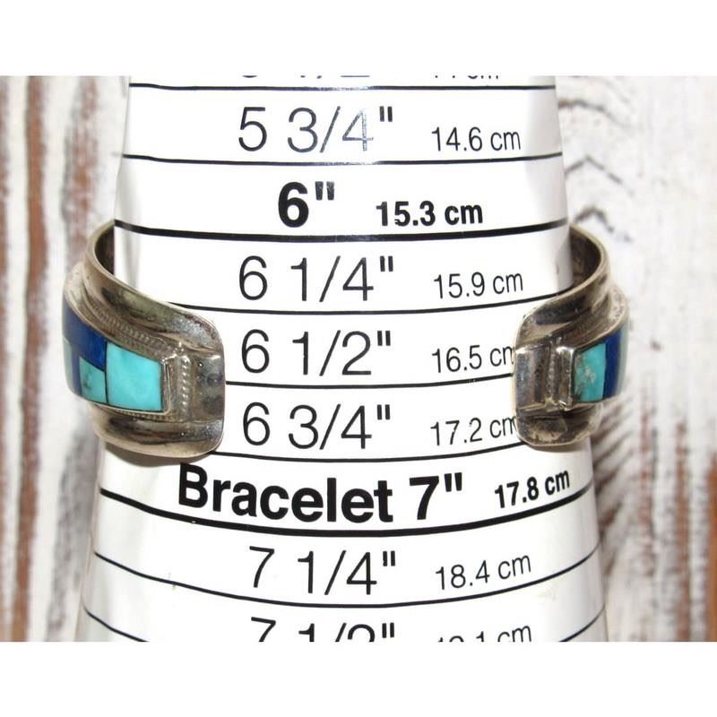 Impressive Native American Navajo sterling silver and colorful multi stone inlay cuff bracelet by the Navajo artist R. Brown. The cuff features an intricate stone inlay of natural turquoise from various the southwestern mines and lapis lazuli in sterling silver setting. The cuff measures over 1" wide with inside circumference of about 6 3/4" including the gap. Te gap by itself is 1 1/4". The cuff is made of thick gauge silver and stone inlay all around and can not be adjusted due to the design. Stunning statement example of wearable Native American art to add to any jewelry collection!