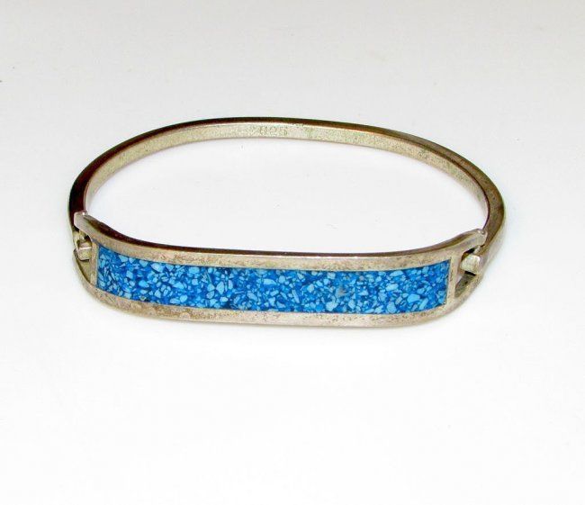 For your consideration is this lovely vintage Mexican sterling silver bracelet accented with blue turquoise chip inlay. The inside circumference of the bracelet is about 7 1/2", and the piece is marked "925" on the inside.