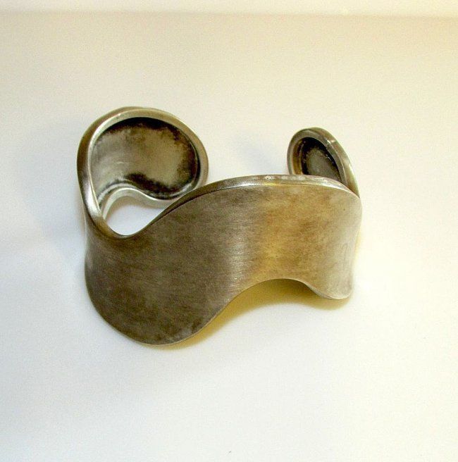 For your consideration is this stylish vintage Mexican sterling silver cuff bracelet. This elegant piece features an asymmetrical design in sterling silver. It is marked "925" and "Mexico" on the back as shown. The lovely bracelet measures 2 1/2" from side to side and can be carefully adjusted.
