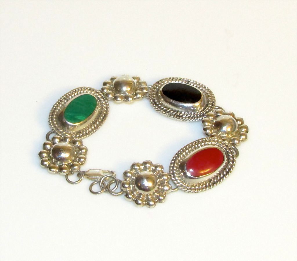 For your consideration is this lovely vintage Mexican sterling silver bracelet with colorful onyx black, coral red, and malachite green accents. This beautiful piece measures about 7 1/4" long. It is unmarked, but has been tested and confirmed sterling silver.