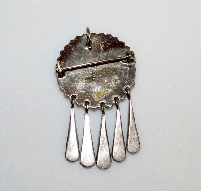 For your consideration is this lovely vintage Taxco sterling silver dangle brooch/pendant. This colorful piece features an interesting design in sterling silver accented with stunning green malachite chip inlay. The piece can be used as a brooch and as a pendant. The piece measure 2" long by 1" wide. Marked "925" and "Taxco" on the back. Matching earrings are available. Please check out shop inventory.