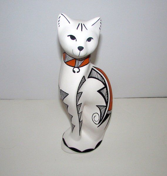 For your consideration is this gorgeous and gracious cat figurine fetish, hand etched by a talented Acoma pueblo artist, S. Chino. The cat has an intricate collar and stunning design all around. The back of the cat is covered in geometric designs in traditional black, terracotta and white colors. The piece is signed as can be seen in the photo. 10 3/4" tall x 4" wide. A powerful symbol that offers protection, deep psychic and spiritual awareness. No chips, cracks, repairs.