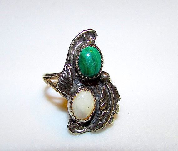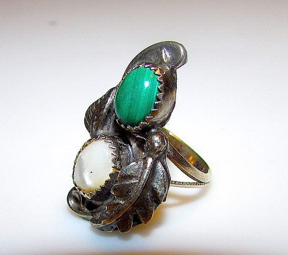 For your consideration is this wonderful vintage Old Pawn Navajo sterling silver, malachite and mother of pearl ring in size 5. The ring features an intricate, classic vintage squash blossom design in sterling silver accented with malachite and MOP cabochons. Superior craftsmanship, excellent attention to detail. Unmarked as most vintage Native American jewelry and has been tested for silver content. Size 5. Nice patina. Can be polished upon request. Superb vintage piece to add to any jewelry collection!