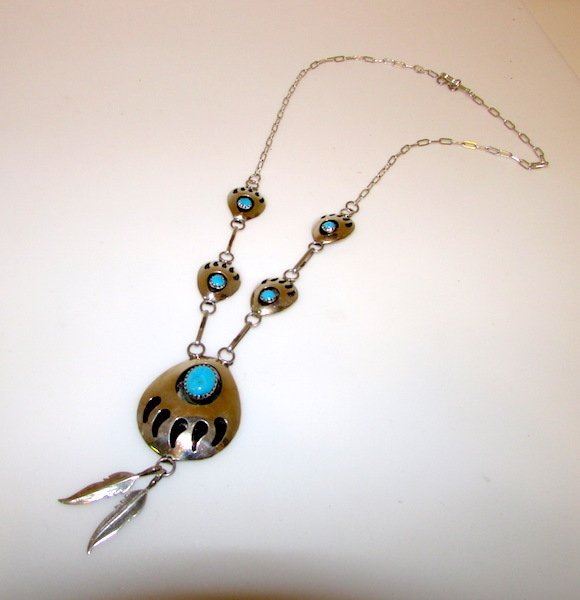 Fabulous Navajo sterling silver and turquoise bear paw larger necklace. Bear is a powerful symbol of strength and courage in Native American culture. The necklace is the larger size of similar style and design necklaces. Wonderful condition.