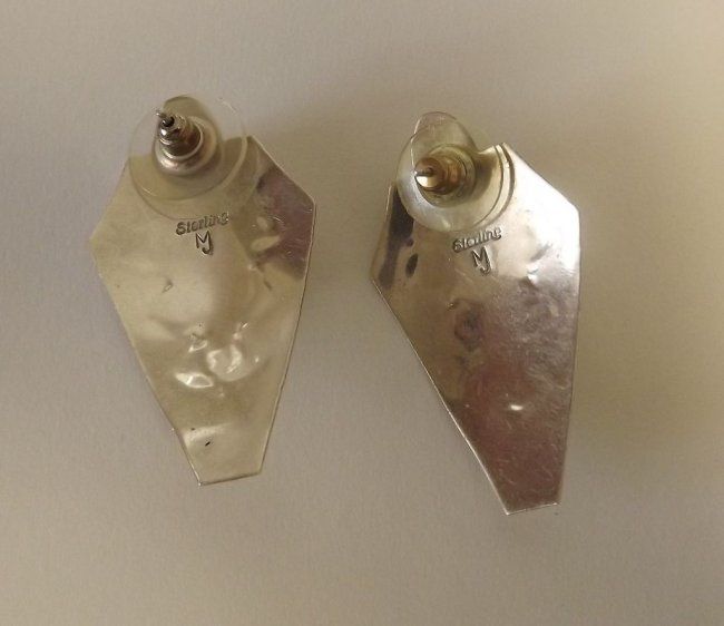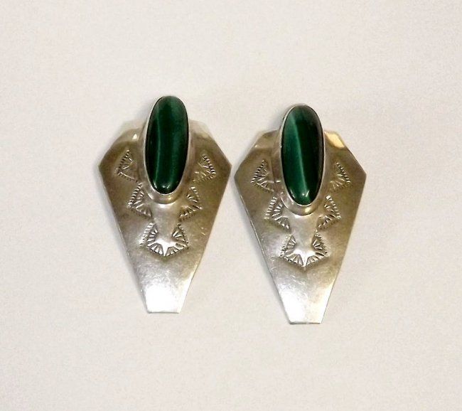 For your consideration is a pair of lovely vintage Navajo sterling silver and malachite pierced earrings. The beautiful pieces feature a unique design in sterling silver accentuated by deep green malachite cabochons. The earrings measure 1 3/4" by 1". Signed "MJ" by the artist and stamped "Sterling" on the back.
