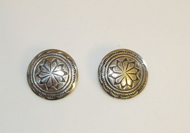 For your consideration is a pair of these beautiful vintage Navajo sterling silver pierced earrings in wonderful vintage condition. These beauties feature a ceremonial Navajo basket design in sterling silver and measure about 1" in diameter. The earrings are marked "sterling" on the back. These wonderful earrings with classic Navajo design will make a fabulous addition to any jewelry collection!