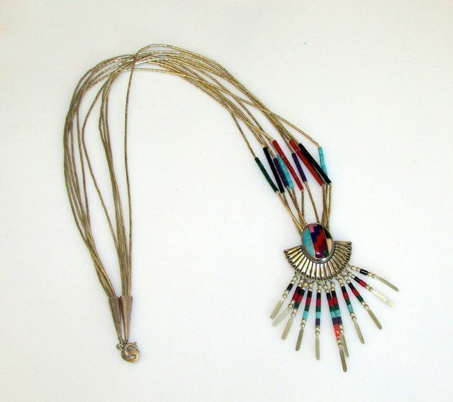 Fabulous vintage Native American Navajo inlay necklace in wonderful vintage condition. This spectacular example of vintage Native American Art features a multiple sterling silver strand design necklace accented with coral, lapis, turquoise, and malachite accents on each side. The necklace is is adorned with an intricately inlaid sterling silver fringe pendant. The necklace is marked "sterling" on the pendant and on the necklace and is stamped with the artist's hallmark. The necklace measures about 28" long including the pendant and the pendant measures 3" long by 1 1/2"