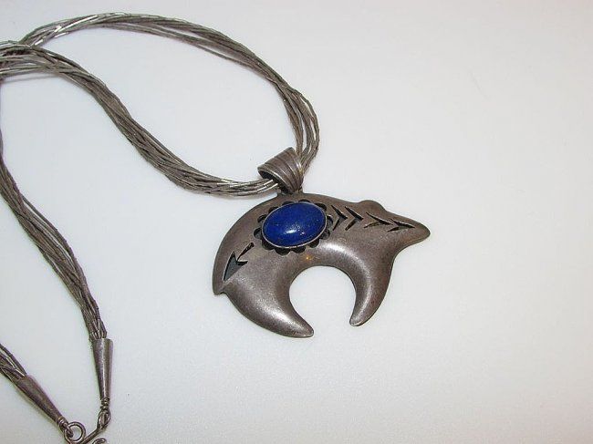 For your consideration is this fabulous vintage Native American Navajo bear pendant necklace by a talented and highly collectible artist Martha Willeto "MW". The bear pendant features a detailed design in sterling silver accented with a gorgeous deep blue lapis cabochon with beautiful matrix. The pendant is stamped with the artist's hallmark "M W" and is marked "sterling". The necklace features multiple strand liquid silver design and is marked "sterling" as well. The bear pendant measures 2" tall including the bail by 2" wide. The necklace measures about 19" long not including the pendant.