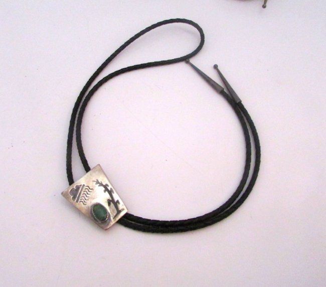 Exquisite vintage Native American Navajo sterling silver and turquoise bolo tie. Marked \"sterling\" and signed by the artist. Good condition.