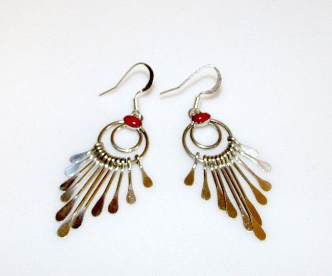 For your consideration is a pair of these gorgeous vintage Native American sterling silver coral pierced earrings in wonderful vintage condition. These dangling beauties feature an intricate design in sterling silver accented with genuine red coral cabochon. The earrings are a pierced type and measure 2 1/4" total length. These incredible statement earrings do not have a "pulling" feeling and are really comfortable to wear. Unmarked and have been tested for silver content.