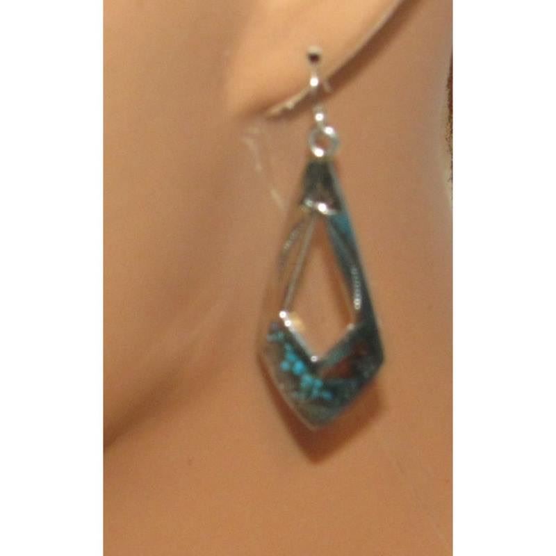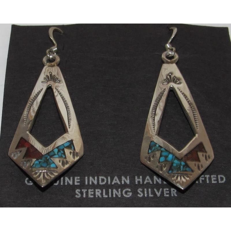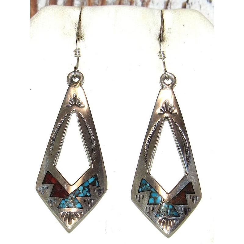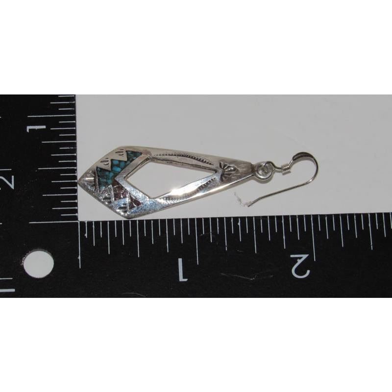 Navajo Dangle Earrings Tribal Design Turquoise Coral Inlay J. Yazzie