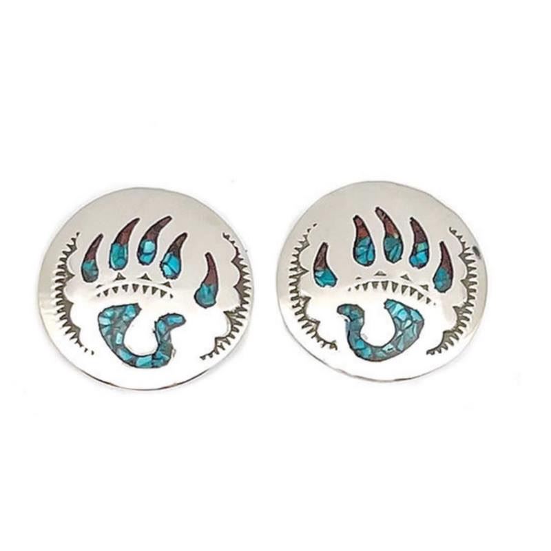 Navajo Earrings Bear Paw Design Turquoise Coral Inlay Joleen Yazzie