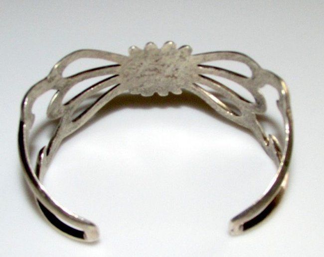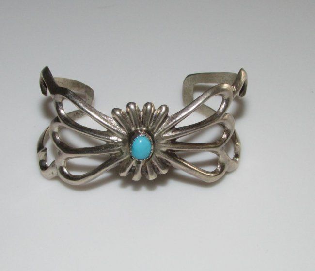 For your consideration is this fabulous vintage Old Pawn Navajo sterling silver and turquoise sand cast cuff bracelet in wonderful vintage condition. This beautiful piece offers a traditional sand cast design in sterling silver accented with a gorgeous blue turquoise cabochon. The bracelets measure 1 1/4" at the widest point and the inside circumference is about 7" including gap. It can be carefully adjusted. The piece is unmarked as most Native American jewelry of the time period and has been tested for silver content. Gorgeous piece to add to any jewelry collection!
