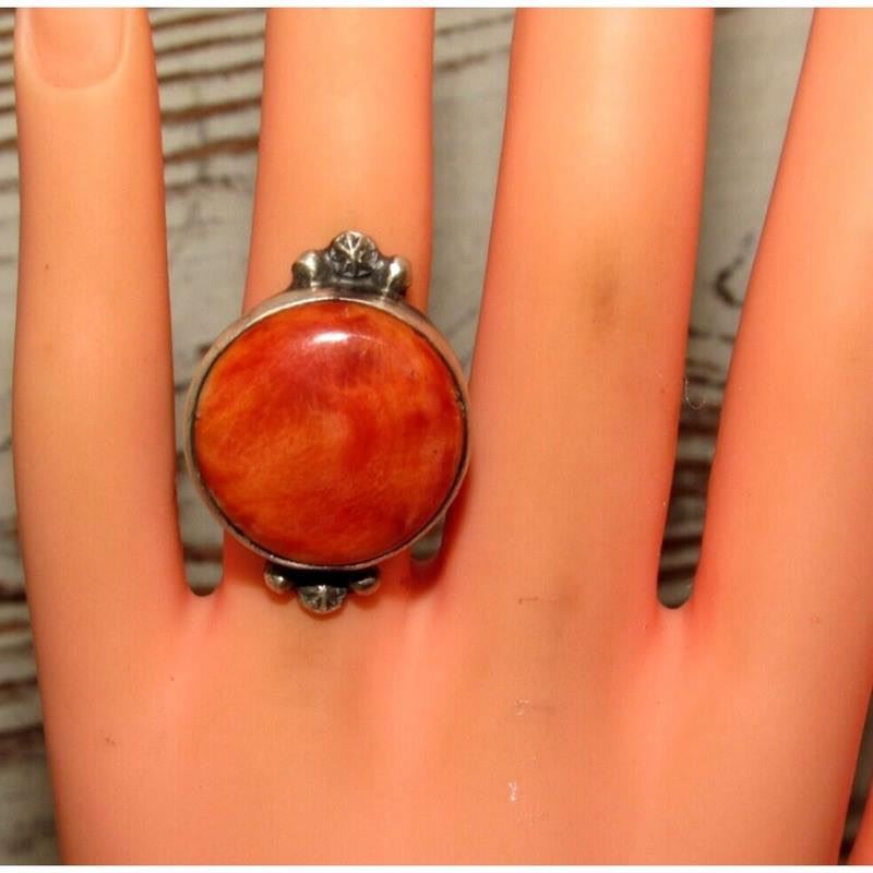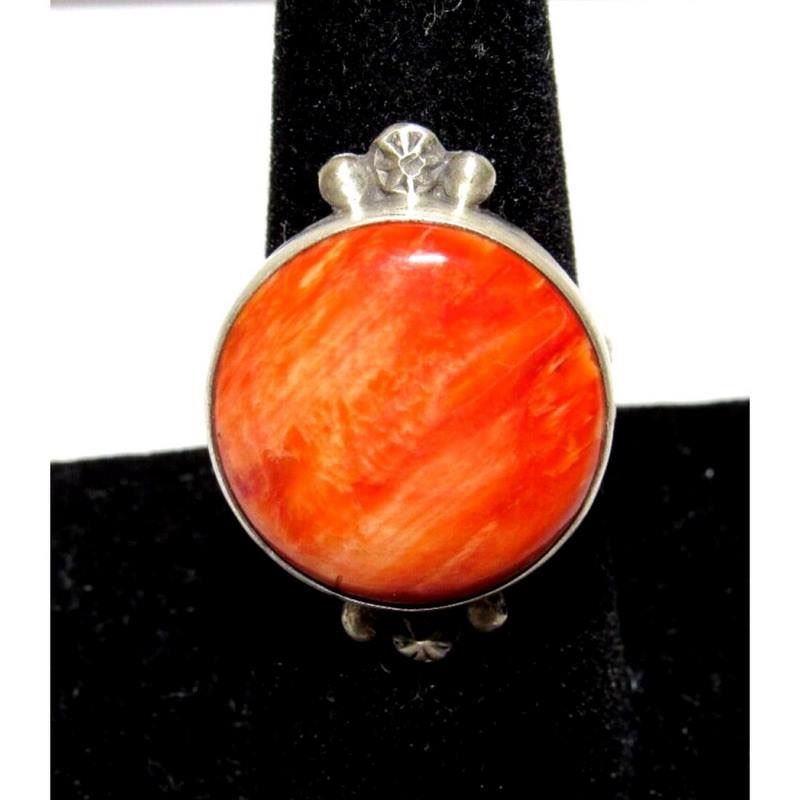 For your consideration is this stunning Navajo sterling silver, and a round orange spiny oyster ring size 6. Measures about 1" on the front. Fab classic Native ring. Wonderful example of wearable Native American art to add to any jewelry collection!