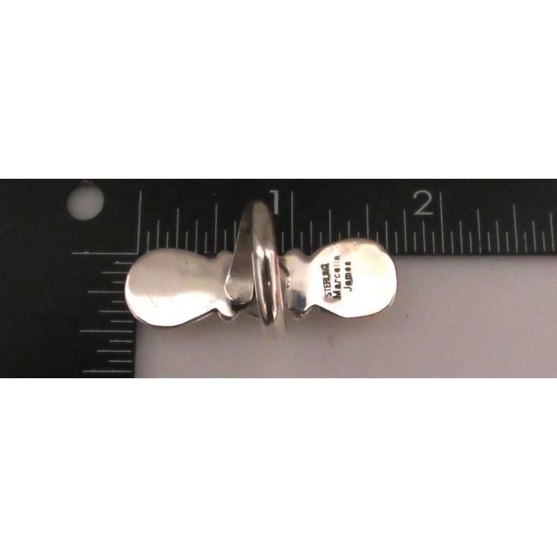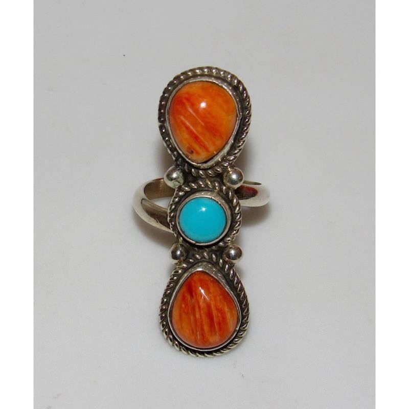 For your consideration is this stunning large statement Native American Navajo sterling silver, turquoise & orange spiny oyster ring size 7.5, adjustable, by the talented Navajo artist Marcella James. This gorgeous ring features an intricately hand etched, detailed traditional Navajo design, accented with 1 beautiful turquoise stone & 2 gorgeous orange spiny oyster stones set in sterling silver. Exceptional craftsmanship and attention detail. The ring is signed by the artist. The ring is size 7.5, adjustable. The front of the ring measures about 1 1/2" tall. Stunning example of wearable, collectible Native American art to add to any collection!