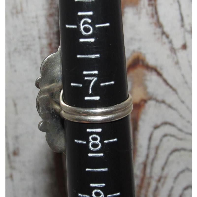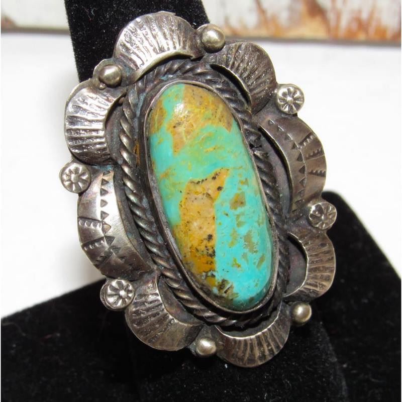 For your consideration is this stunning Navajo sterling silver and Royston turquoise statement ring in size 7.5. The ring features intricately hand etched blossom design in sterling silver accented with an oval Royston turquoise cabochon. Marked sterling and is signed by the artist. Superb craftsmanship, exceptional attention to detail in this collectible piece. The ring is size 7.5 and measures a little over 1 1/2" tall on the front. Fab statement piece!