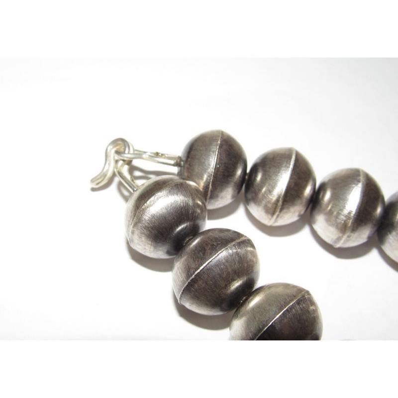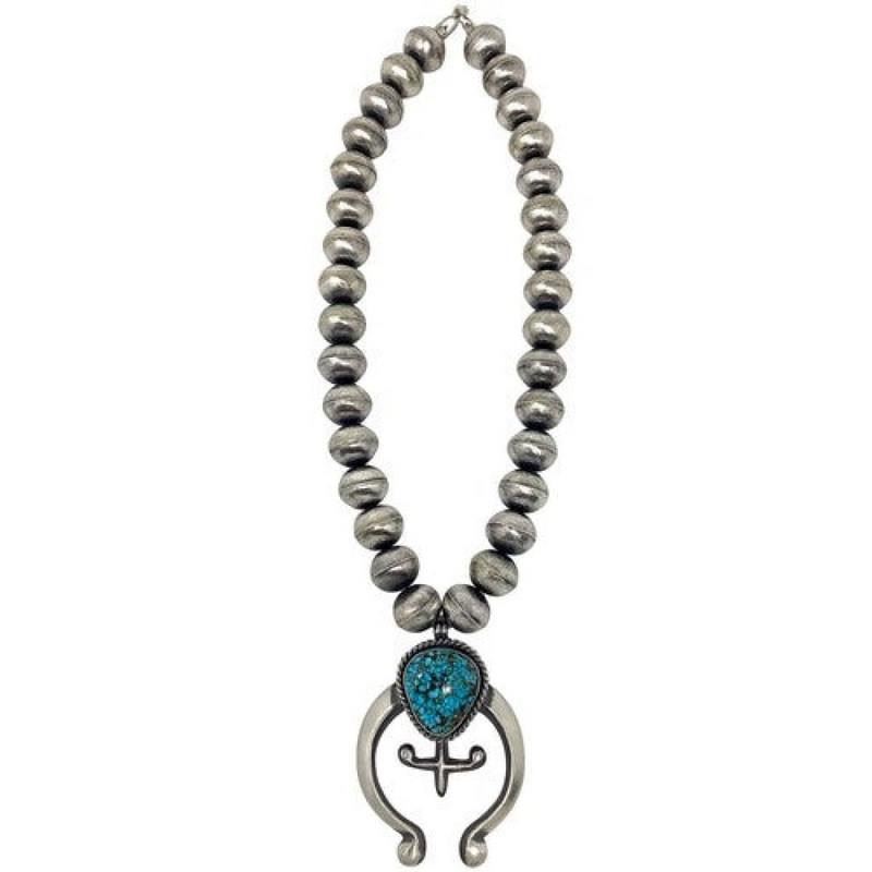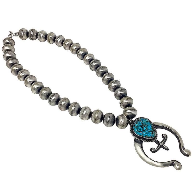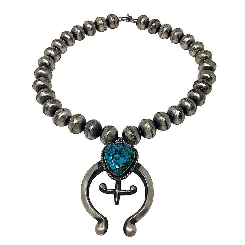 Spectacular Native American Navajo Eugene Hale sterling silver and Number 8 mine turquoise squash blossom necklace. This stunning example of collectible Native American art features a traditional Navajo squash blossom design in sterling silver with hand etched Navajo pearls saucer beads, and a sand casted sterling naja pendant with stunning Number 8 turquoise cabochon in the middle. The necklace is marked sterling and is signed by the artist. The naja pendant measures about 2 1/2" tall including bail by about 2" wide. The necklace is 18" long including pendant. The necklace weighs impressive 111 grams. Outstanding work of art! Superb statement piece, collector necklace.