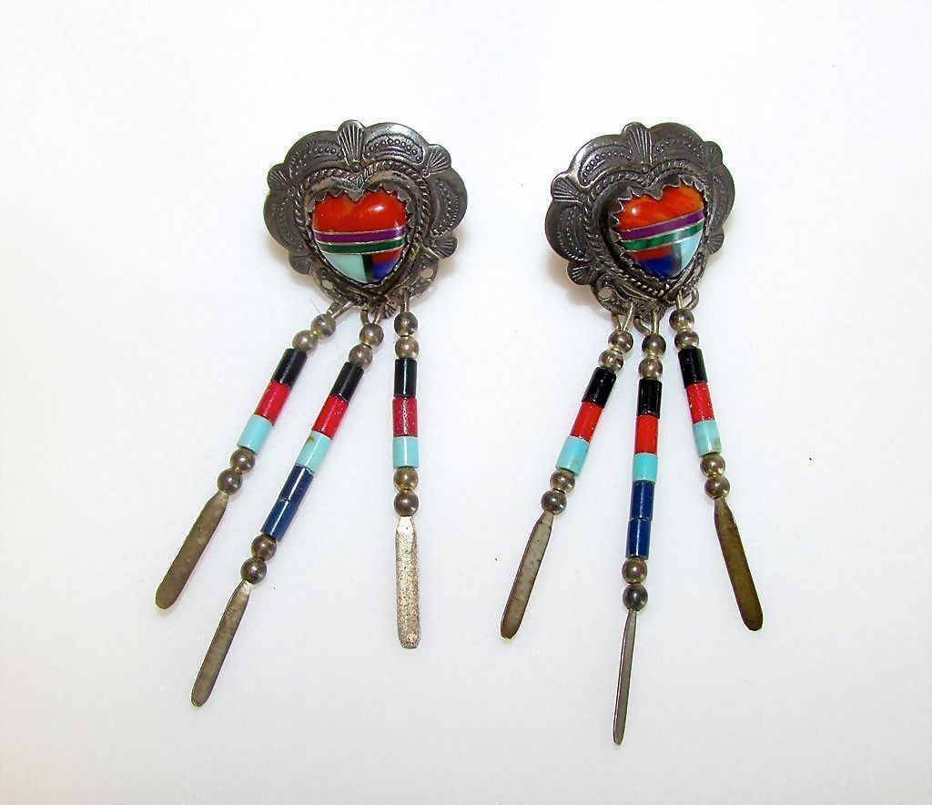 For your consideration is a pair of these vintage Navajo sterling silver and genuine stone inlay earrings in nice vintage condition! This beautiful pair offers a heart shaped design in sterling silver accented with dangles and genuine turquoise, coral, malachite, lapis and onyx inlay. The earrings are a pierced type and measure 2" long. Marked J.C. and Sterling on the back.