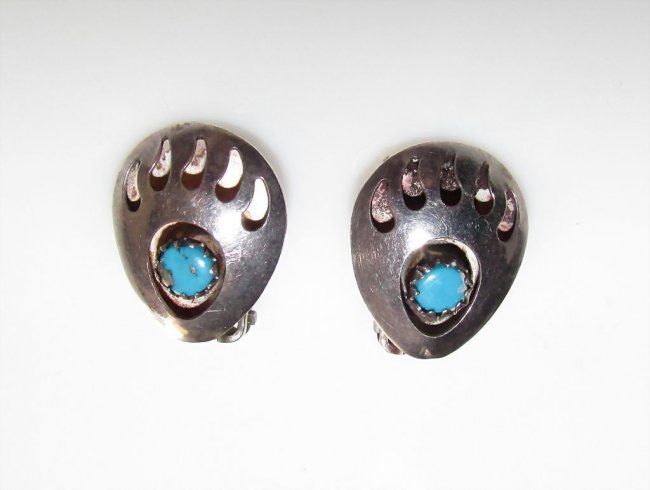 For your consideration is this classic vintage Navajo sterling silver and turquoise clip on earrings. These beauties feature traditional bear paw design in sterling silver accented with turquoise cabochons. Bear paw is a symbol of strength and power. These beautiful earrings measure 1/2" and are in wonderful vintage condition. Unmarked as majority of Native American jewelry from the time period.