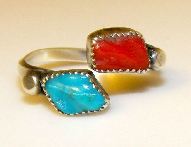 For your consideration is this lovely vintage sterling silver turquoise and coral adjustable ring in wonderful vintage condition. This versatile ring features a classic design in sterling silver accented with one turquoise and one coral cabochons. A fabulous ring to add to any collection! It is adjustable and is stamped with the artist\'s hallmark \"BF\" . The ring has been tested for silver content.
