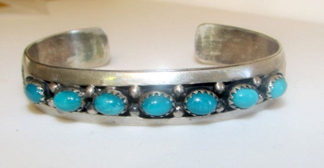 For your consideration is this spectacular vintage Navajo sterling silver and turquoise cuff bracelet by a highly collectible artist C. Yazzie. This fantastic vintage piece offers a traditional Navajo design with an amazing attention to detail accented with a row of gorgeous blue green turquoise. The cuff measures 1/2" wide and the inside circumference is about 7 1/2" including gap. The bracelet can be carefully adjusted. It is stamped with at artist's name C. Yazzie on the back. A fabulous quality piece to add to any collection!