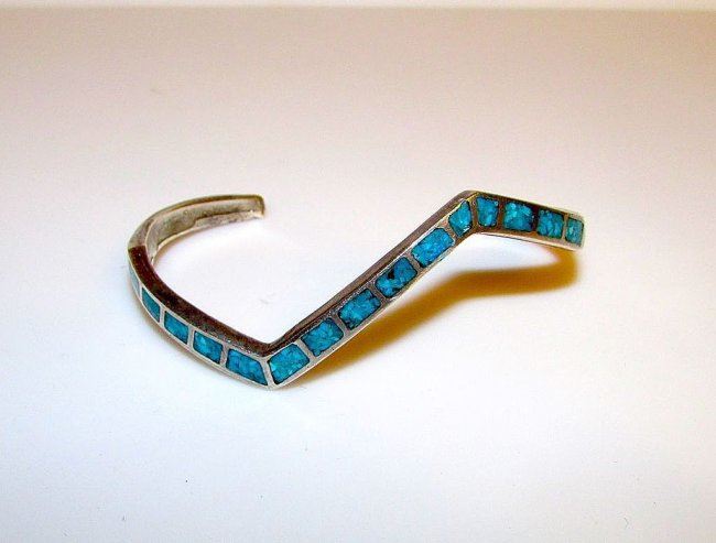 For your consideration is this fabulous vintage Navajo sterling silver and turquoise chip inlay cuff bracelet in wonderful vintage condition. This beautiful piece features a zig zag design in sterling silver accented by turquoise chip inlay. Unmarked as most jewelry from the time period and has been tested for silver content. The bracelet is adjustable. Fabulous addition to any jewelry collection!