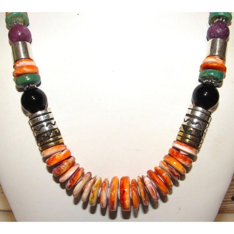 Phenomenal Navajo Tommy & Rosita Singer orange spiny oyster, sterling silver, 12K gold overlay, and semiprecious stones necklace including sugilite, tiger eye, turquoise, etc. The necklace is about 20" long, hallmarked T&R Singer on the sterling barrel beads for Tommy and Rosita Singer. Accent stones may vary from piece to piece. Stunning, colorful, collectible beauty to add to any jewelry collection!