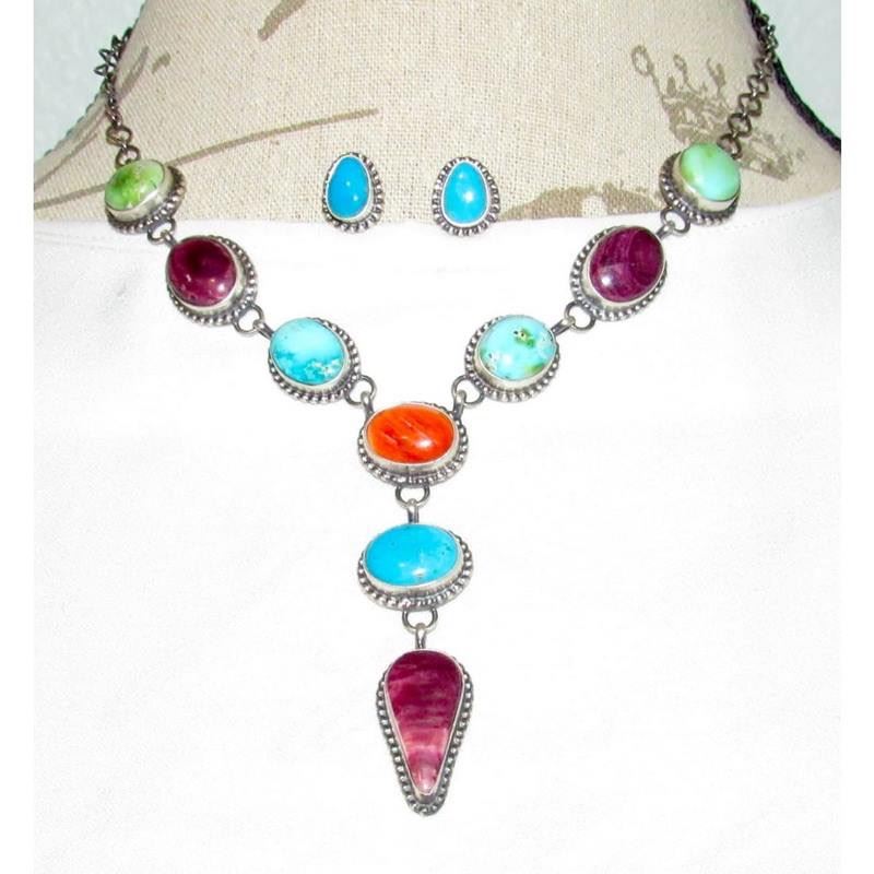 Navajo Turquoise Spiny Oyster Lariat Necklace Earrings Sterling Silver D. Begay