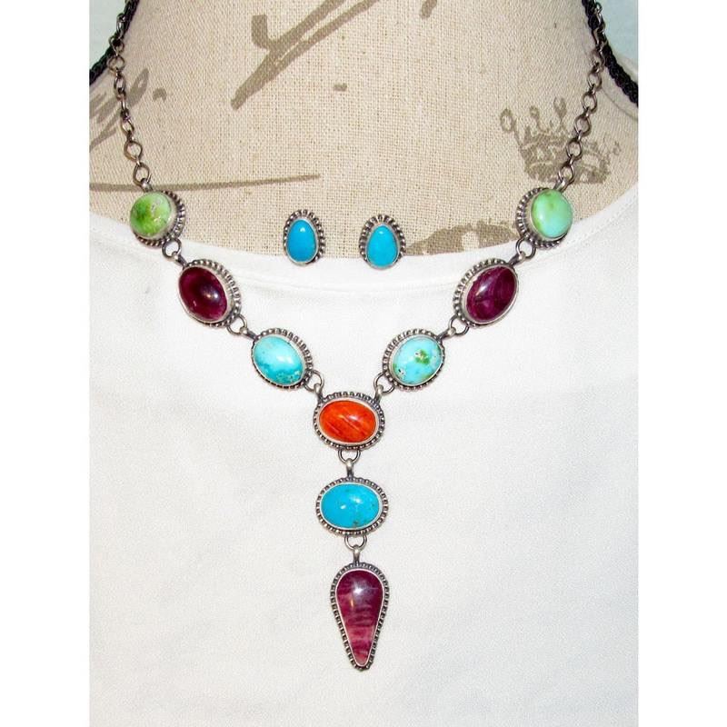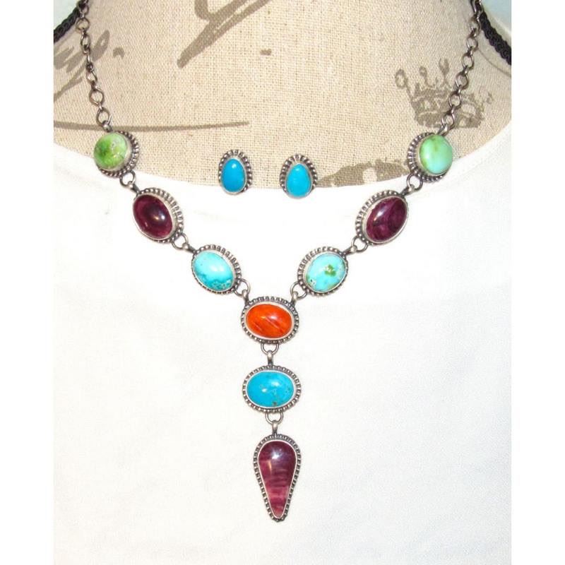 For your consideration is this outstanding Navajo sterling silver, gorgeous Kingman& Royston turquoise and orange and purple spiny lariat design necklace and earrings set by D. Begay. Traditional hand-etched lariat design with gorgeous turquoise stones and spiny oyster stones with lobster type closure. This fab necklace measures 24" long and weighs about 52g. Phenomenal example of gorgeous, wearable Navajo art to add to any jewelry collection! FREE SHIPPING ON ALL JEWELRY ORDERS WITHIN THE US!