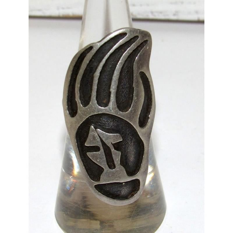 Stunning vintage Hopi sterling silver bear paw overlay design ring in size 5.5. Wonderful vintage collector piece with traditional, detailed bear paw design symbolizing strength and courage. The ring remains in nice vintage condition with patina, age appropriate wear. Signed by the artist, tested sterling. Measures about 1 1/2" tall on the front. Size 5.5. Great as a pinky finger. Stunning, meaningful, vintage Hopi ring to add to any jewelry collection!