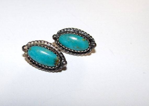 For your consideration is a pair of these wonderful vintage Navajo sterling silver and turquoise pierced earrings in wonderful vintage condition. These fabulous Old Pawn pieces feature a traditional, hand etched design in sterling silver accented with stunning blue turquoise cabochons. Measure about 1/2" long. Unmarked as most Old Pawn jewelry pieces and have been tested for silver content. Nice patina and can be polished upon request. Fabulous addition to any jewelry collection!
