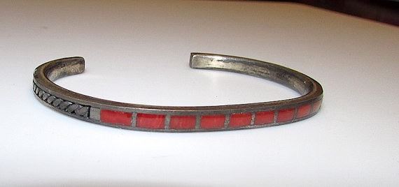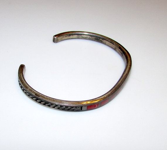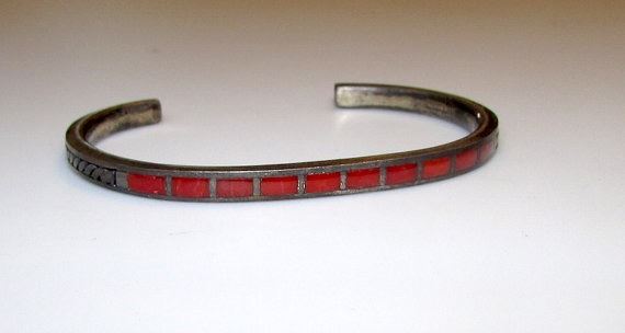 For your consideration is this fabulous vintage Old Pawn Zuni sterling silver and coral inlay cuff bracelet for smaller wrists in wonderful vintage condition. The bracelet features a classic cuff design in sterling silver accented with a row of gorgeous deep red coral cabochons inlay. The cuff measures about 6"-6 1/2" inside circumference and can be slightly adjusted. Unmarked as most Native American jewelry from the time period. Wonderful addition to any jewelry collection!