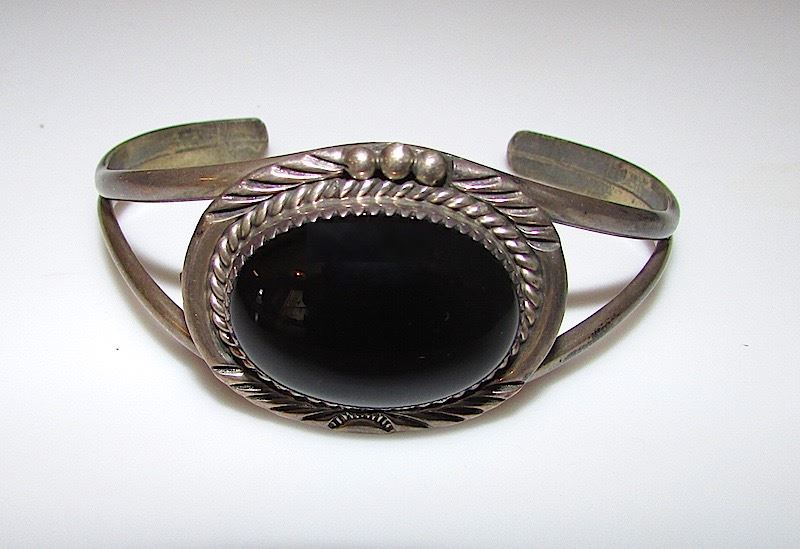 For your consideration is this fabulous vintage Old Pawn Navajo sterling jet onyx cuff bracelet, 1" wide and about 6 1/2" inside circumference including gap. The cuff can be carefully adjusted