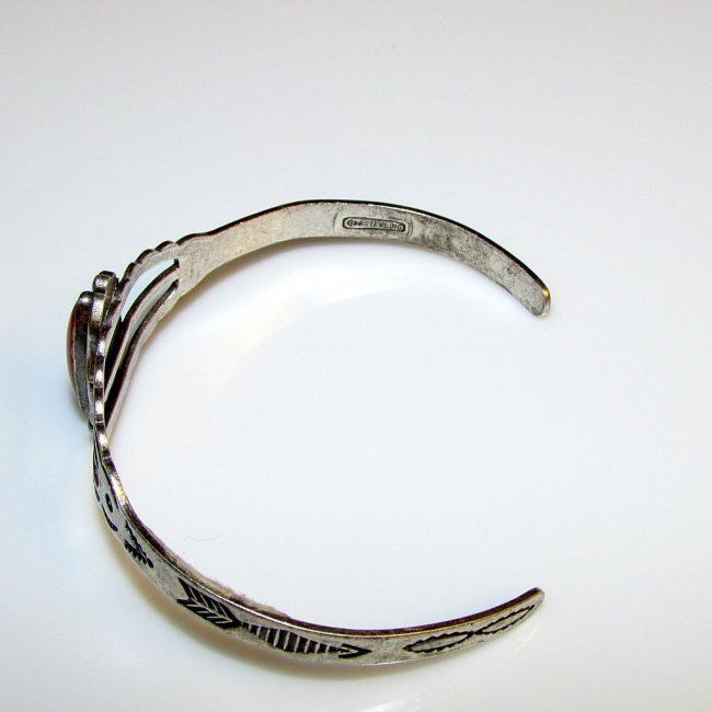 For your consideration is this gorgeous vintage Navajo sterling silver and coral cuff bracelet from 1960s in wonderful vintage condition. This beauty features a traditional Native American design in sterling silver and is accented with a beautiful red coral cabochon. The cuff measures about 1" wide at the widest point and the inside circumference is about 6 1/2". It can be carefully adjusted. The piece is marked "Sterling".