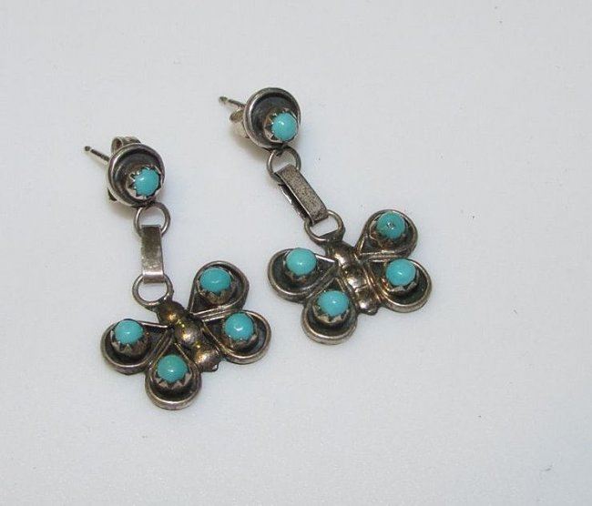 For your consideration is a pair of these gorgeous vintage Zuni sterling silver and sleeping beauty mine turquoise in wonderful vintage condition. These beauties feature an intricate butterfly design in sterling silver accented with stunning blue turquoise cabochons. The earrings are a pierced type and measure 1 1/2" long. Unmarked as most Native jewelry from the time period and has been tested for silver content.