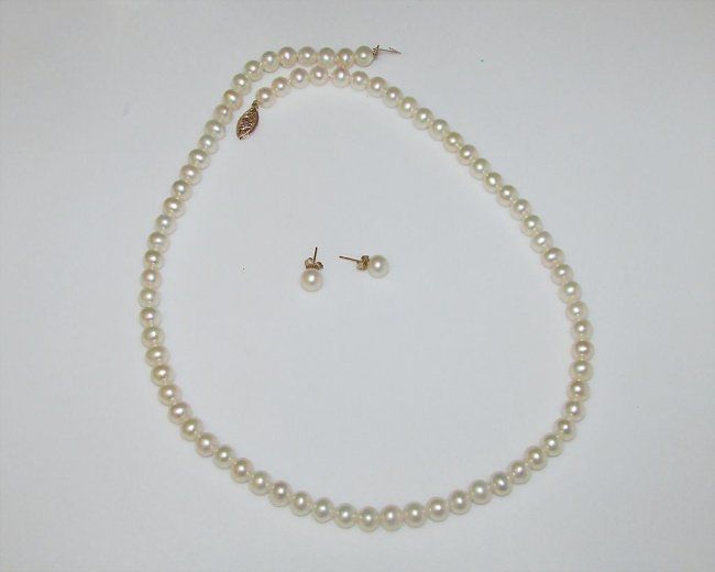 For your consideration is this fabulous, lustrous, vintage cultured pearl necklace with a 10K gold filigree clasp and matching earrings in wonderful vintage, well cared for condition. These timeless beauties feature a classic design with beautiful luster and are accented with 10K gold. The pearls measure about 6-7 mm wide and the necklace is about 18" long. The necklace is nice and tight despite its age and is a wonderful piece of classic jewelry that will always be in style! The necklace is marked 10K on the filigree clasp and the earrings are marked 10K on the posts.