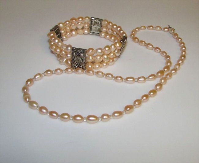 For your consideration is this lovely vintage lustrous pink cultured pearl necklace and bracelet set in wonderful vintage condition. The necklace features a classic single strand design with a sterling silver clasp marked "925". It measures 18" long. The bracelet features a triple strand design with silver tone accents, it is adjustable and fits most size wrists. An elegant pink cultured pearl duo to add to any collection!
