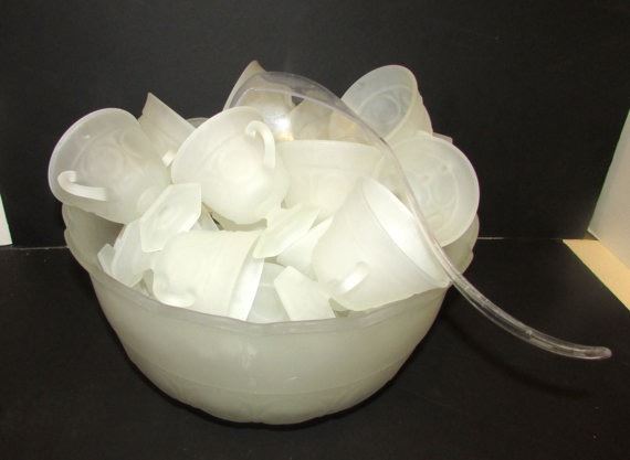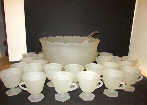 For your consideration is this fabulous and very elegant vintage Tiara frosted glass punch bowl set in Provincial Pattern. The set remains in wonderful vintage condition and includes a stunning punch bowl, 23 footed serving cups, and a ladle. Only a limited amount of the set in this pattern has been been produced and the pattern has been retired since the early 1980s. No chips, cracks, repairs. Superb addition to any collection! Elegant and gorgeous!