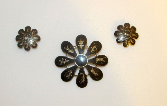 For your consideration is this wonderful rare Siam sterling silver niello brooch and clip on earrings set in wonderful vintage condition. The beautiful trio offers an unusual and rare floral design accented with intricate etchings. The brooch measures about 2" in diameter and the clip on earrings measure about 1" in diameter. Marked "Siam" and "Sterling" on the back.