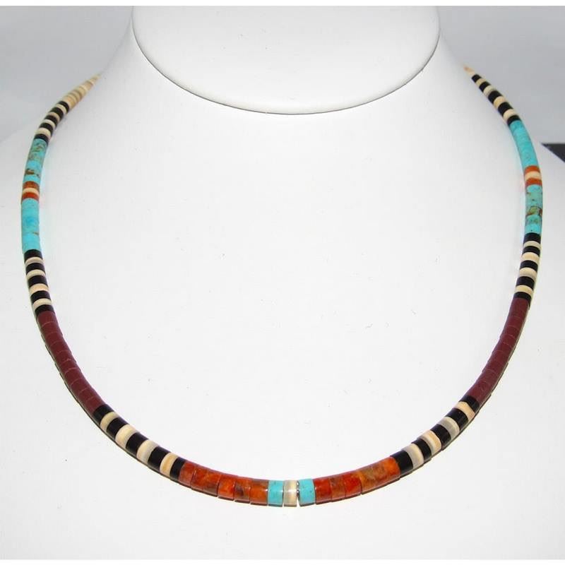 Stunning Santo Domingo pen shell, orange spiny & Kingman turquoise rolled heishi beads choker necklace with sterling silver clasp by the Santo Domingo artist Jeanette Calabaza. Measures about 16" long. Gorgeous, elegant piece that is sure to complement any outfit.
