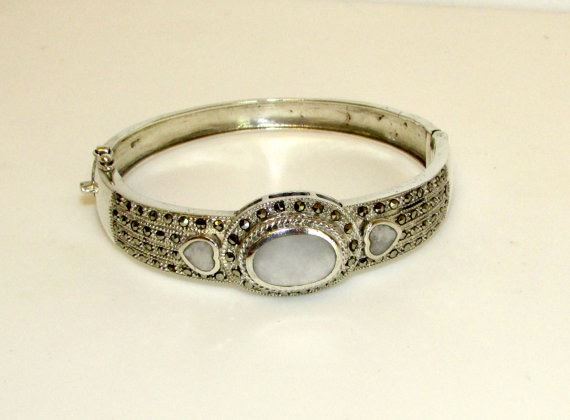 For your consideration is this exquisite vintage sterling silver, marcasites, and mother of pearl bracelet in wonderful vintage condition. This gorgeous piece features an elegant design in sterling silver accented with sparkly marcasites, 2 smaller heart shaped mother of pearl cabochons, and one larger oval mother of pearl cabochon in the middle. The bracelet is about 1" wide at the widest point and the inside circumference is about 7 1/2". The bangle is marked "925" on the inside. Fabulous and stylish piece of jewelry to add to any collection!
