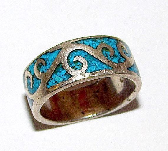 For your consideration is this gorgeous vintage southwestern sterling silver and turquoise inlay ring size 6 with tribal design in wonderful vintage condition. This features a band style design in sterling silver accented with intense blue turquoise inlay. Size 6. Marked 925 and signed by the artist. Wonderful addition to any jewelry collection!